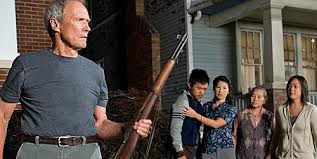 La foto en cuestión no tiene nada de especial, pero tiene un punto a defender: dicen -y no los críticos, si no algunos famosos directores y otros no tanto- que Eastwood es un "yanki de mierda" o que "nunca hay negros en sus películas". No sabemos, ni importa si Eastwood es un gran tipo y un gran padre, pero sí es un gran director, y Gran Torino tiene mucho de su país de origen y tiene mucho de una película de acero, que no se rompe y que siempre va al frente. Pero, por sobre todas las cosas, y ya lo dije varias veces, habla de un tiempo y lo marca, habla de la vejez de un viejo norteamericano que vive con los coreanos. ¿Por qué explicar que Gran Torino es una excelente película? por que no hace falta, sólo se califica con la calidez y la paciencia en que Eastwood cuenta su relato y su ambigüedad para los autos y para las armas. No es de loco armar una pre escena de un tipo que "va a la guerra" -o sea, va a morir- y antes de ello se corta el pelo y se pone perfume. Es de un tipo con pasión, y bueno, si se quiere, también, de un poco loco. Lo del corte de pelo, habla de mucho: "uh, es un héroe", o "waw, que genio, que maestro". Pero, Eastwood es un líder del cine, él, es un maestro noble y fuerte y arma una película con un relato y un ritmo frenético y clásico, hermoso y sin pelos en la lengua. ¿El último relato? irónico, con la familia que no le dio nada, y la que se cagó de risa de él, creyendo que era un viejo estúpido, la deja afuera, para regalarse ese auto de oro al chino que se lo quiso robar, pero mas que eso, en sí, a su alumno.